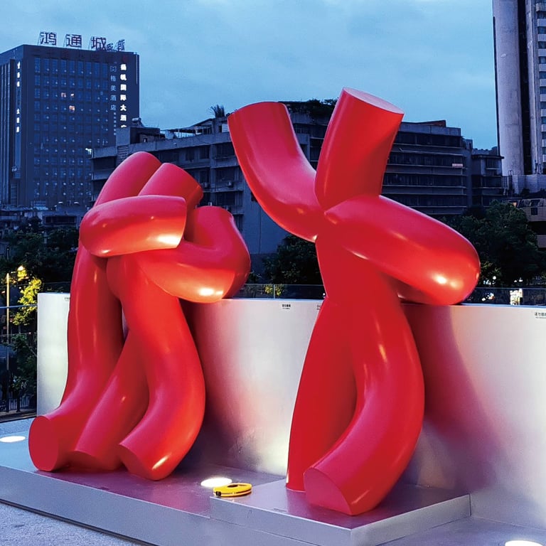 Among his notable works is the “Tube Series” — sculptural works composed of tubular forms that evoke flow, connectivity, structure, and modern spatial aesthetics. For instance, one piece in the series titled “Embrace — The World” features two tubular figures embracing, a powerful statement of unity and upward aspiration, placed publicly along Guangzhou’s central axis.